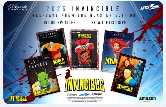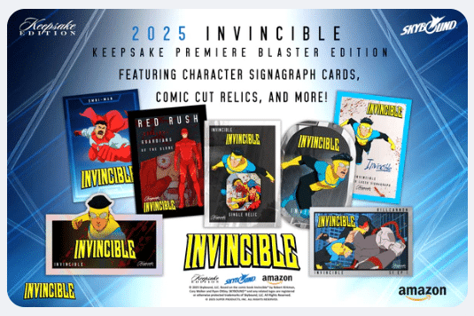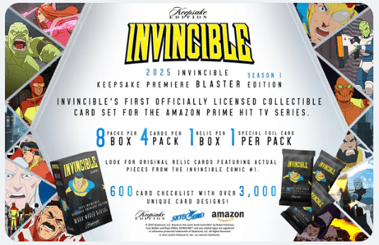 Pour la première fois, collectionnez les cartes officielles de la série TV à succès Invincible ! Keepsake lance cette « Première Édition » très attendue couvrant la Saison 1. Avec une checklist massive de 600 cartes de base et plus de 3 000 variations uniques, c’est le point d’entrée idéal pour tout fan de la série.
